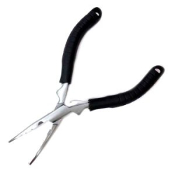 2. Плоскогубцы. Оснащены длинными тонкими губками, что делает их идеальным инструментом для извлечения глубоко засевших крючков. Изготовлены из прочного металла с тефлоновым антикоррозийным покрытием. Оборудованы резцами из карбида вольфрама, которые с легкостью перекусывают лески и шнуры. Резцы легко снимаются, их можно без проблем заменить в случае необходимости (запасные приобретаются отдельно). Также плоскогубцы оснащены приспособлением для зажимания обжимных трубочек. Прорезиненные ручки позволяют комфортно работать, удерживая плоскогубцы в мокрой руке. Длина – 17 см. Вес – 147 г.