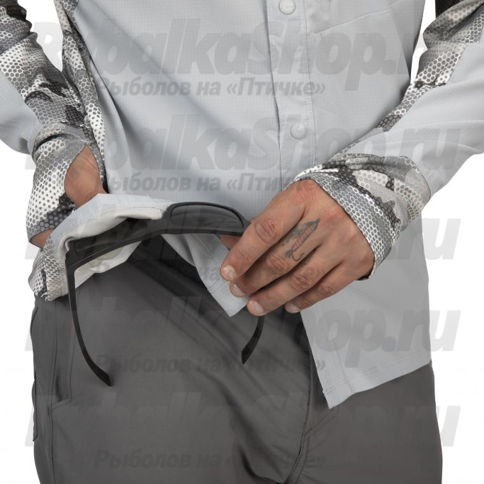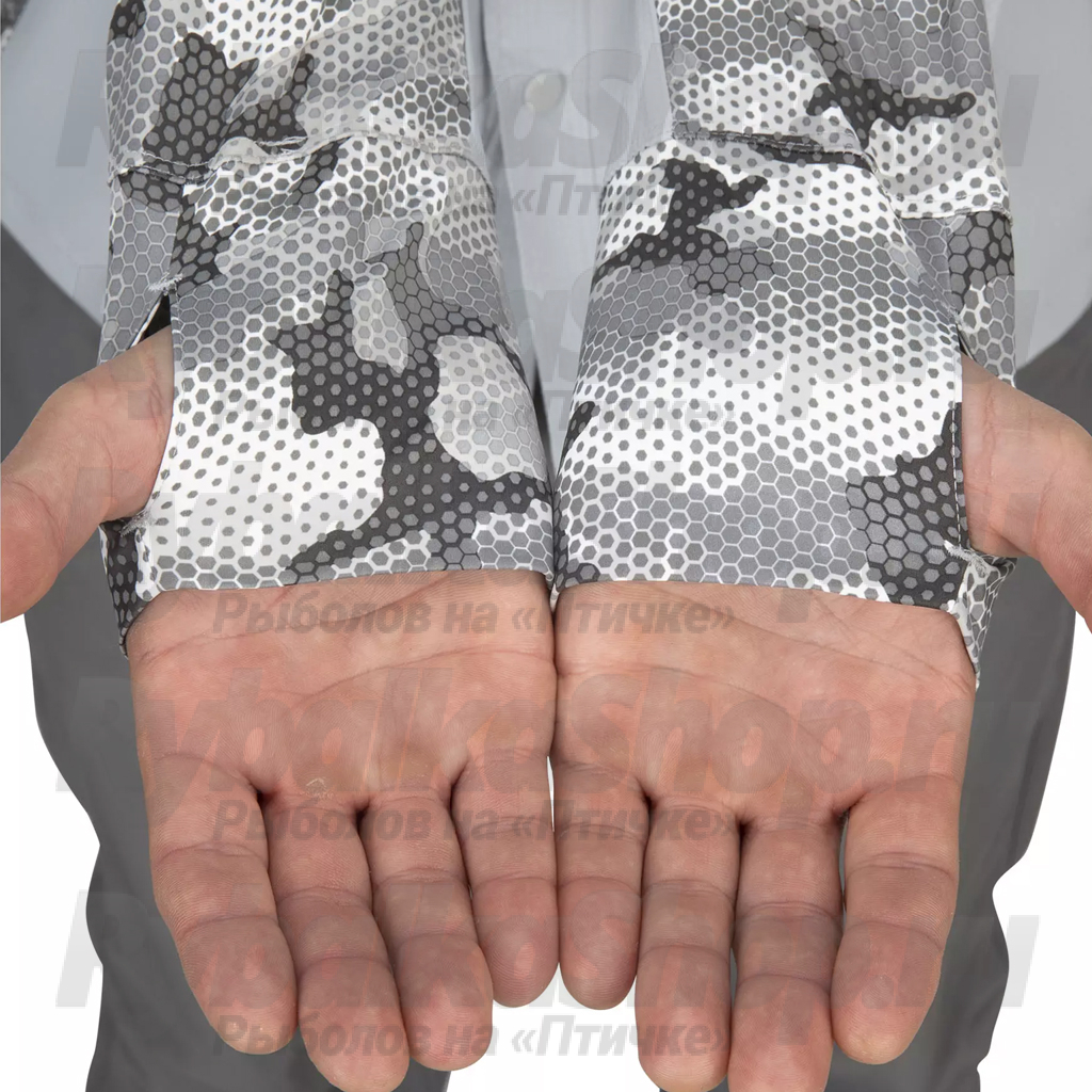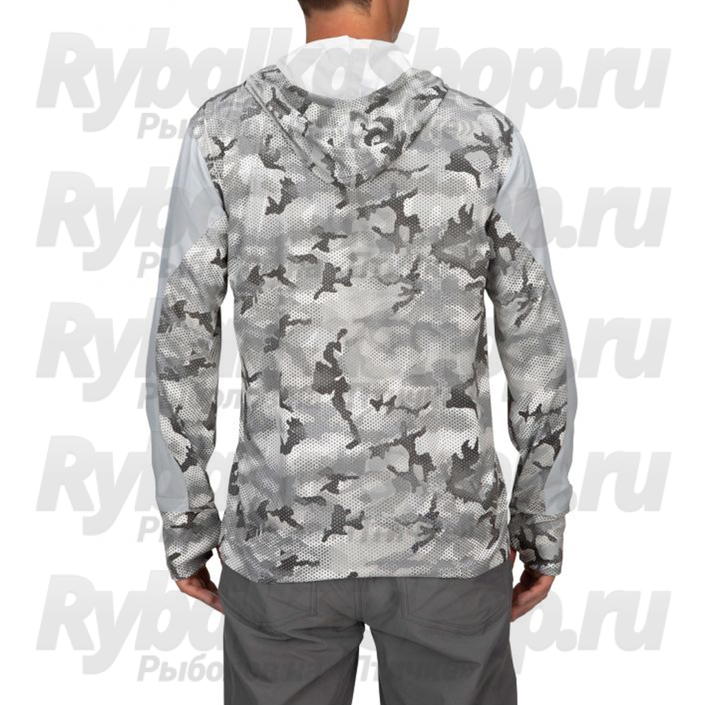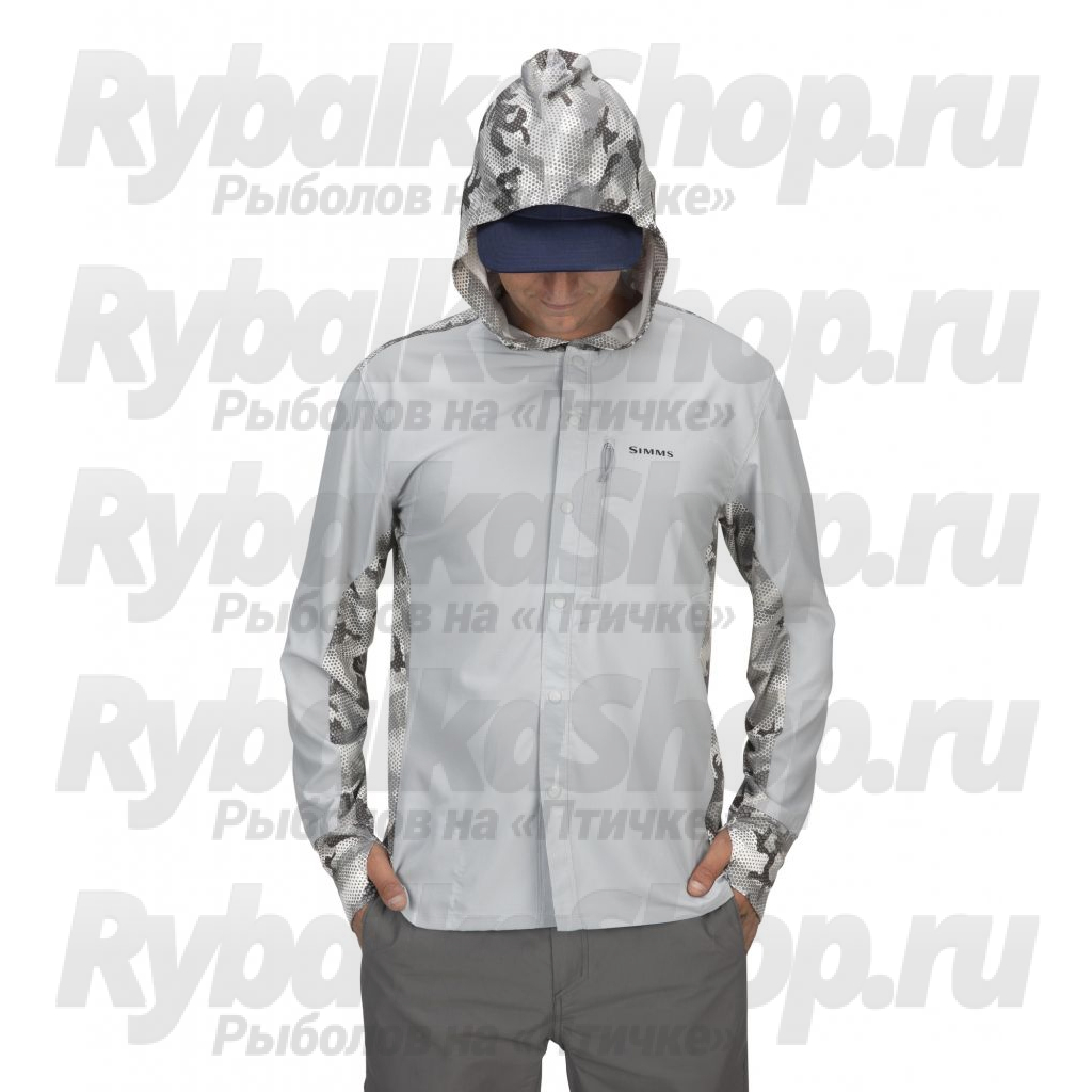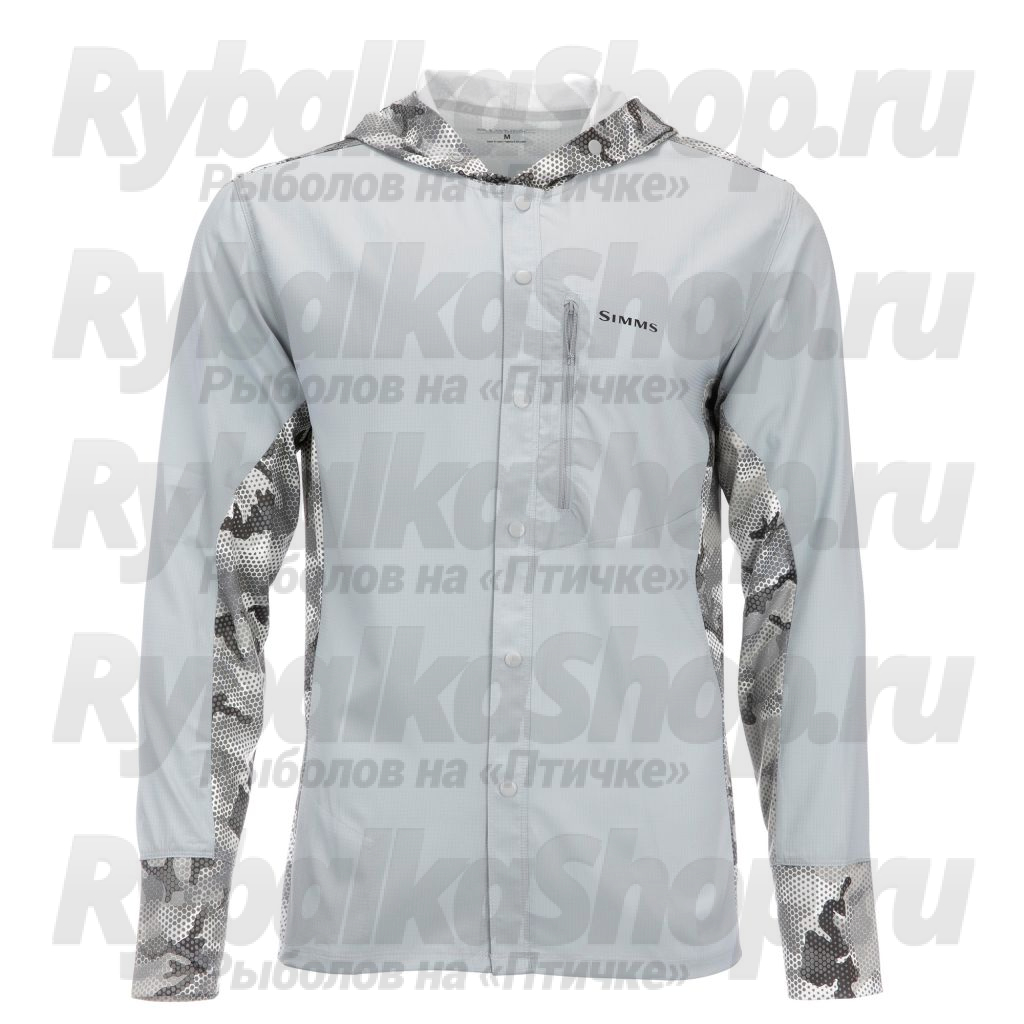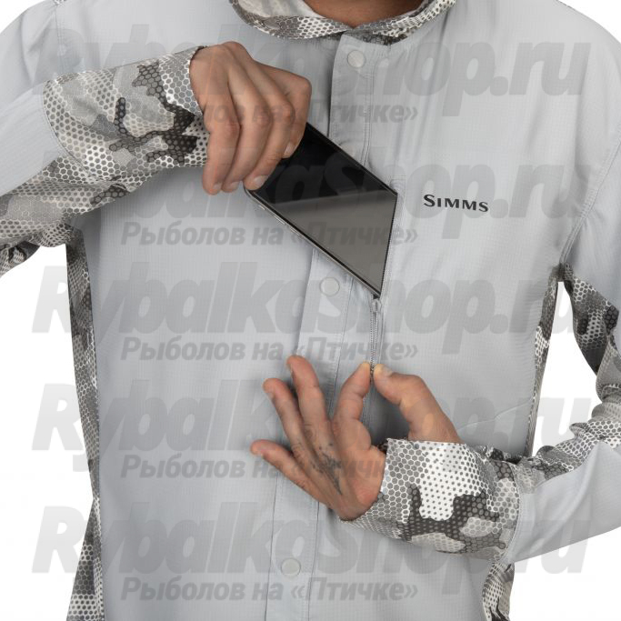 Simms Intruder Fishing Hoody, Hex Flo Camo Steel - высокотехнологичная рубашка с эластичными боковыми вставками, увеличивающими диапазон движения.