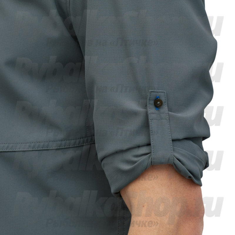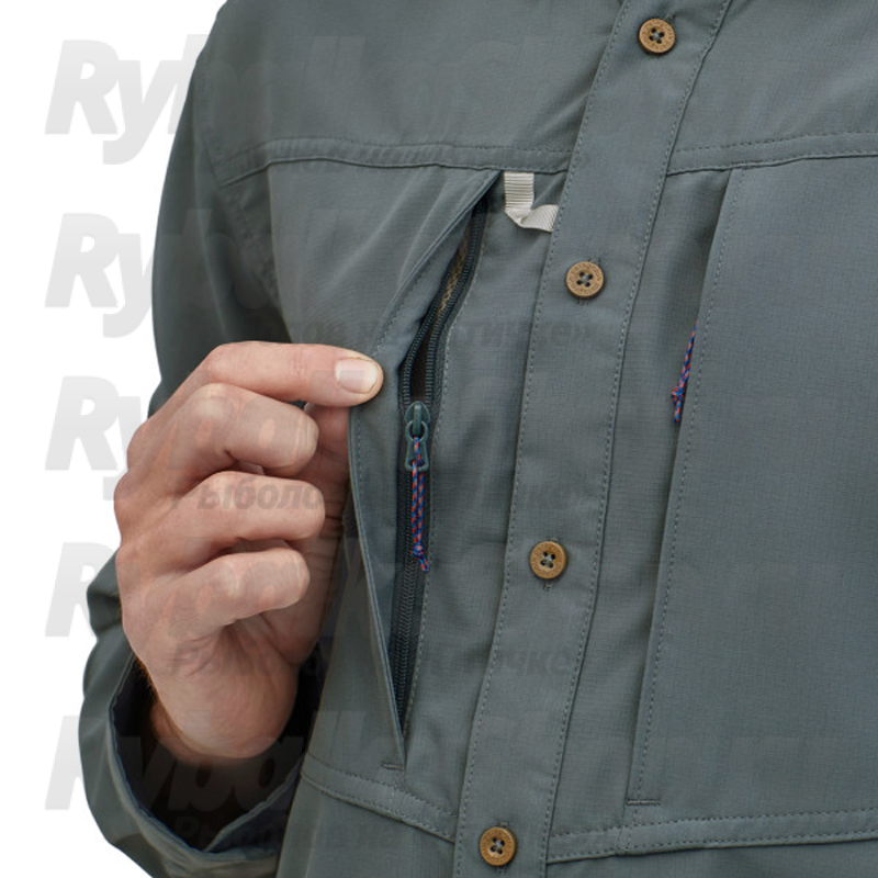 Рубашка с длинными рукавами изготовлена из легкого быстросохнущего полиэстера рипстоп с защитой от солнца 50 UPF. Двухслойный воротник остается на месте со скрытыми кнопками в точках воротника, и его также можно надевать, чтобы дополнительно защитить заднюю часть шеи от солнечных лучей. Охлаждающая сетчатая ткань в центре спины и боковых вентиляционных отверстиях пропускает любой ветерок, обеспечивая комфорт в самых жарких условиях. Рубашка с длинным рукавом имеет два больших нагрудных кармана с молниями из нержавеющей стали для коробок с мухами и других мелких предметов, а также держатель для инструментов возле правого кармана.