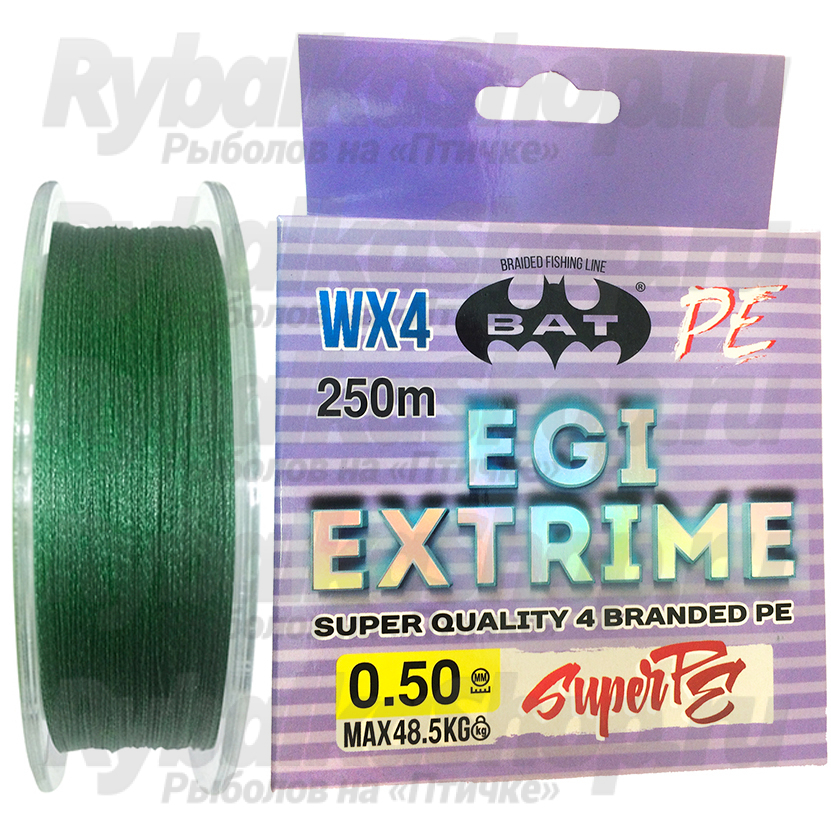 Бюджетный 4х-жильный шнур BAT PE EGI Extrime Green. Благодаря плотному плетению, шнур устойчив к абразиву и имеет нулевое растяжение. В связи с этим шнур обладает нужными характеристиками для результативной рыбалки!