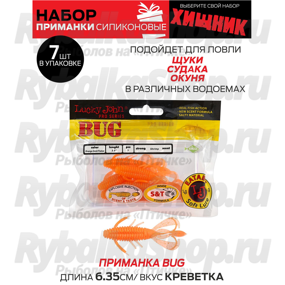 Комплектация 02 ХИЩНИК: BUGSY SHAD 2.8in(07.20)/S88 7шт., BUG 2.5in (06.35)/S68 7шт., NAYADA 2,5in (06.35)/033 7шт., NAYADA 2.0in (05.10)/033 9шт., NAYADA 2.0in (05.10)/071 9шт.