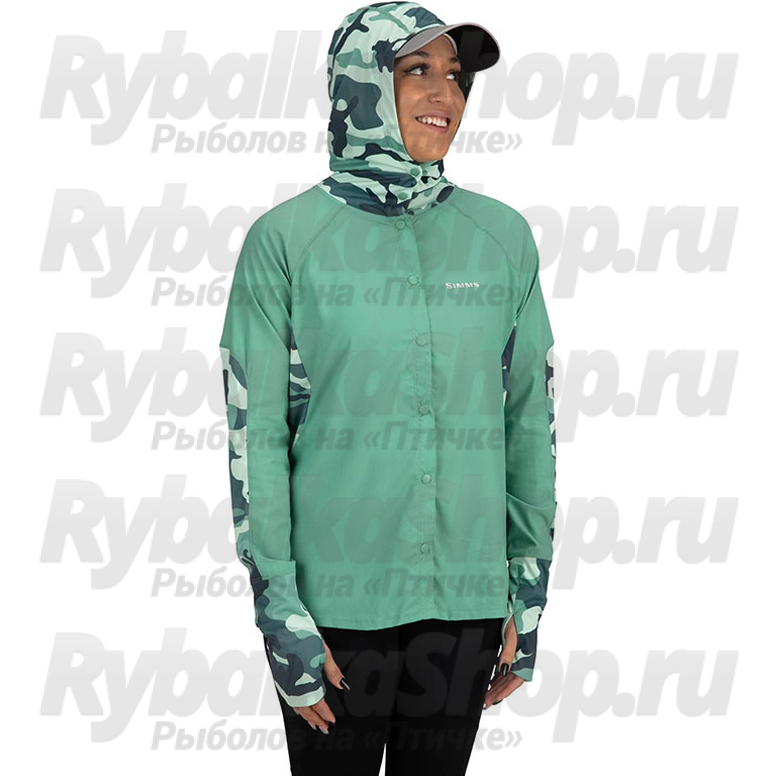 Женская рубашка для рыбалки Simms Women's BiComp LS Shirt '22, Woodland Camo Avalon защищает от солнца, обеспечивая при этом мобильность и комфорт благодаря эластичным тканям SolarFlex® и легкому быстросохнущему переду.