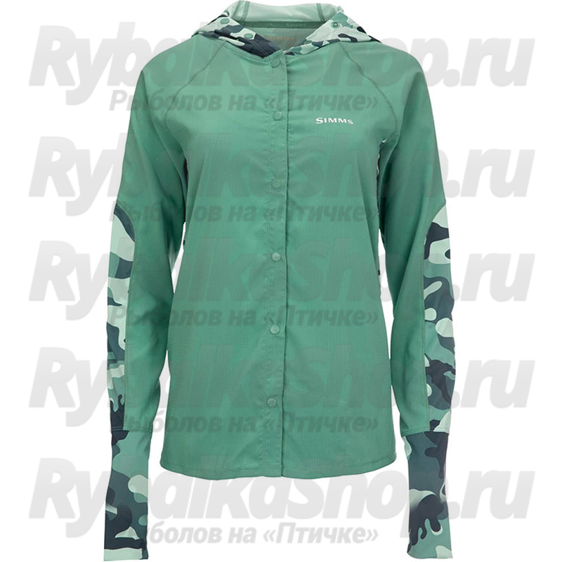 Женская рубашка для рыбалки Simms Women's BiComp LS Shirt '22, Woodland Camo Avalon защищает от солнца, обеспечивая при этом мобильность и комфорт благодаря эластичным тканям SolarFlex® и легкому быстросохнущему переду.