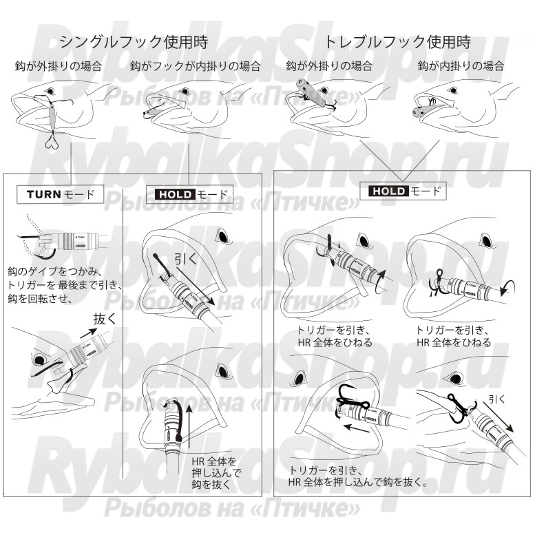 - Режим HOLD - Фиксирует крючок в захвате намертво для дальнейшего его проталкивания, выдергивания или проворачивания. Подходит как для одинарных, так и для тройных крючков.