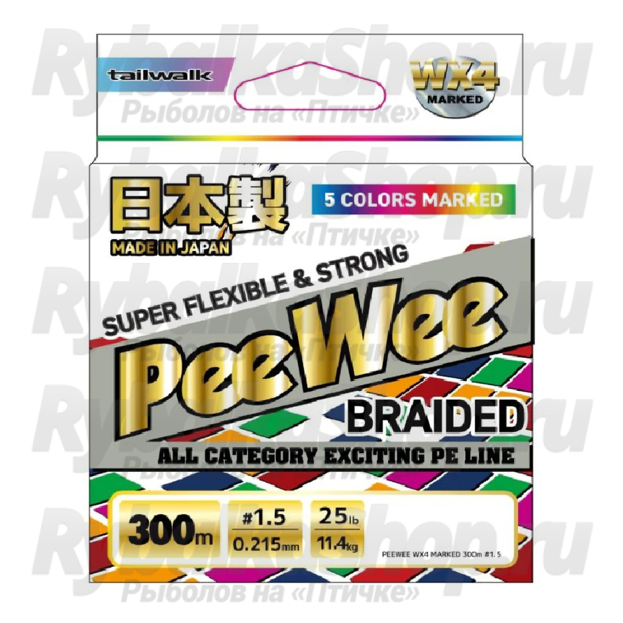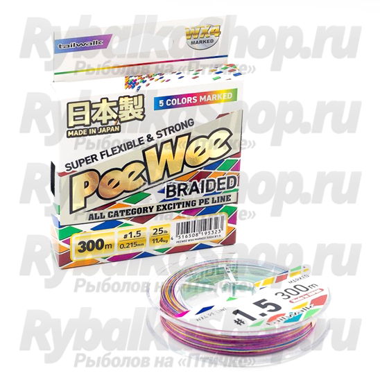 PeeWee WX4 - серия 4-х жильных шнуров от японского бренда Tailwalk. Выделяется не только повышенной прочностью на разрыв, но и улучшенной стойкостью к трению. Благодаря тому, что поверхность шнура довольно скользкая, дальность заброса любых приманок существенно улучшается. Также стоит отметить, что PeeWee WX4 отлично держит любые узлы.
