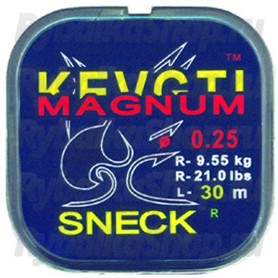 Magnum - монофильная леска от французского бренда Sneck. Выпущена в размотке 30 метров. Отличается высокой прочностью и износостойкостью, что позволяет использовать ее для изготовления поводков. Подходит для донных, поплавочных и спиннинговых оснасток. Качественный полимер, использованный для изготовления серии, не боится отрицательных температур, поэтому Magnum можно применять для ловли со льда. По заявлению бренда, леска калибрована и имеет одинаковый диаметр по всей длине. Для маскировки в воде леска изготовлена прозрачной.