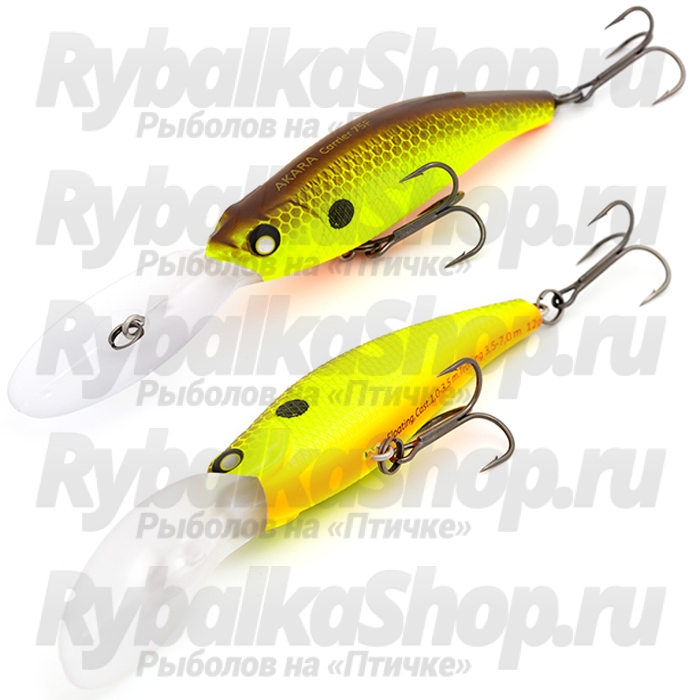 Воблер Akara Carrier 75F - троллинговый воблер класса шед (Shad). Довольно высокое тело и широкая лопасть обеспечивают высокочастотную игру на любой скорости проводки. Приманка отлично держит сильную струю, продолжая стабильно работать. Компактная форма и внушительный вес позволяют использовать ее и при ловле в заброс. Подходит для облова глубоких участков рек и водохранилищ. Плавающий. Акустический. Заглубление при кастинге от 1,0 до 3,5 м, при троллинге 3,5 до 7,0 м.