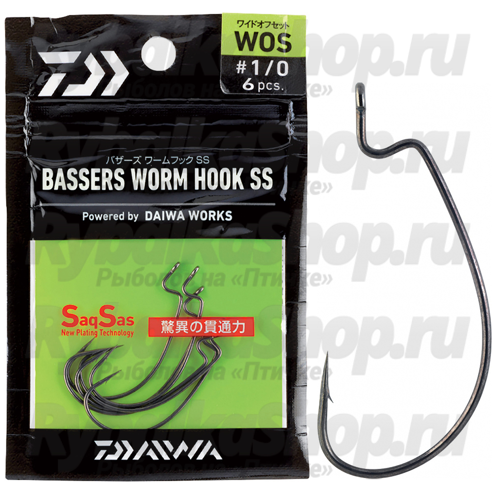 - Особенная острота крючка была достигнута, благодаря ультрасовременной технологии SaqSas, делающей конус жала совершенным. Чтобы крючок Daiwa офсетный Basser's Worm Hook SS WOS долго не тупился, его защищает фторидное финишное покрытие. Есть экспертное заключение подтверждающее, что SaqSas повышает эффективность подсечки крючков на 40 %.