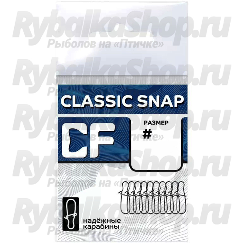 Карабин CF Classic snap — это конструкция, состоящая из элементов, существенно облегчающих монтаж спиннинговых, фидерных и поплавочных оснасток. С помощью застежки можно в считаные секунды заменить приманку или поводок, а вертлюжок не дает шнуру закручиваться во время проводки.