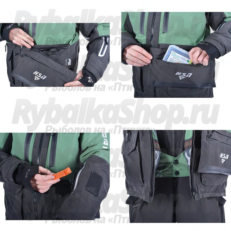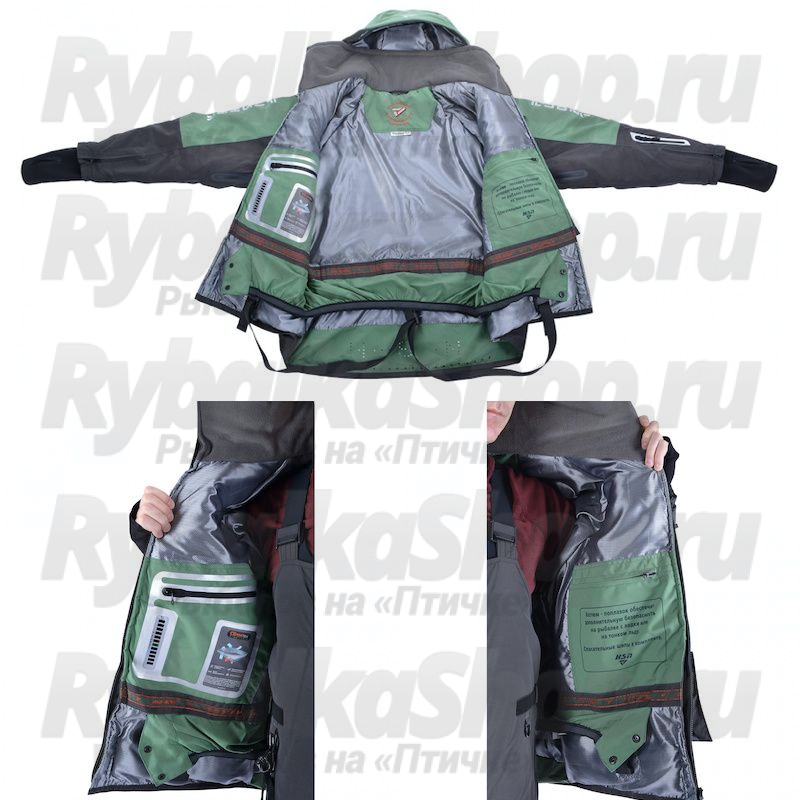 Дизайн костюма и его плавучие свойства тщательно продуманы для обеспечения максимальной безопасности во время рыбалки и активного отдыха на воде или тонком льду.