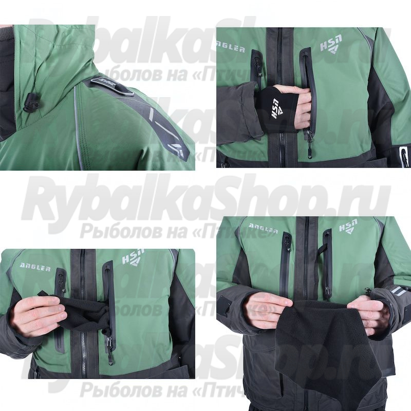 Высокий воротник куртки надёжно защищает от ветра, а удобный капюшон с жёстким козырьком эффективно противостоит ветру и влаге. Глубокие утепленные карманы предназначены для хранения необходимого инвентаря и согрева рук. Дополнительный съёмный карман с пластиковой коробкой для приманок (размером 22*12*2 см) крепится на молнии.