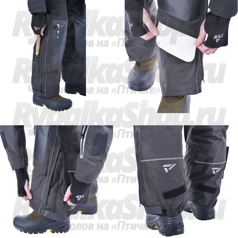 На высоком теплом полукомбинезоне в наколеннике есть специальные съемные вставки из ППЭ. Наколенник усилен дополнительно прочной термоустойчивой пленкой Protectfilm австрийского производства. Низ полукомбинезона имеет перфорацию на ткани для быстрого вытекания воды.