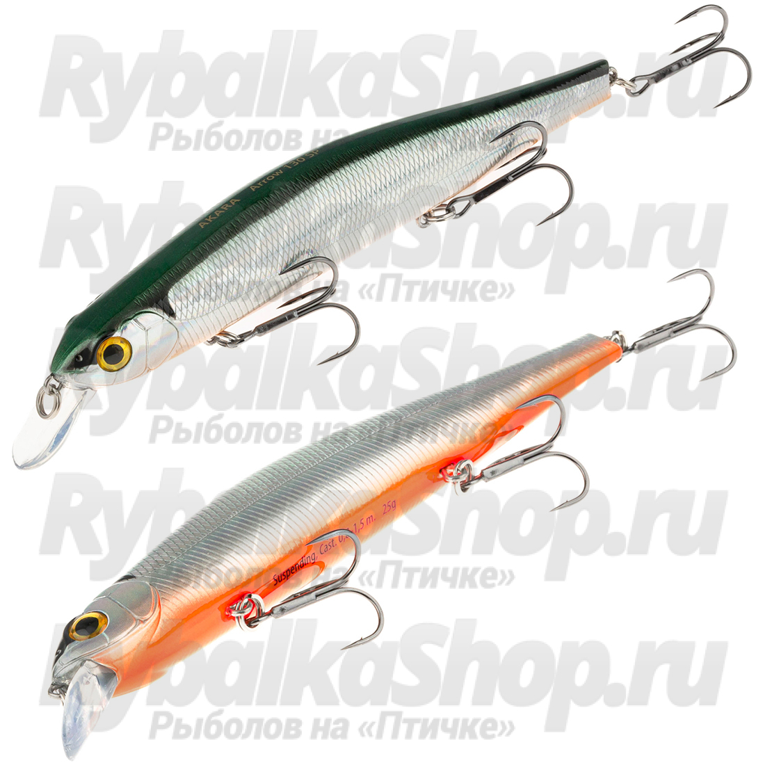 Akara Arrow 130SP - воблер суспендер класса минноу. В первую очередь это щучья приманка для ловли методом твичинг, но благодаря своей довольно активной игре на равномерной проводке, её можно с успехом применять для практически всех видов хищных рыб в водоёмах, как с течением, так и без. Благодаря наличию магнитной системы, обладает отменными полётными качествами и отлично держит струю. Подходит для всех видов проводки с использованием его при ловле в заброс. По щуке особенно рекомендуется проводка с использованием 1-3 рывков и паузами в 1-3 секунды. Чем менее активна рыба, тем продолжительнее паузы. С успехом используется для троллинга на малых глубинах и троллинга с использованием даунригера. Основными объектами охоты данной приманки являются: щука, жерех, кумжа, лосось, окунь, судак. Суспендер. Заглубление при кастинге 0,8 до 1,5 м.
