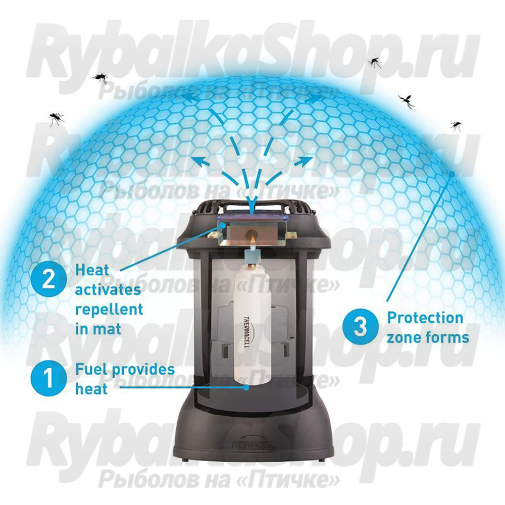 Как и все приборы Thermacell, модель Patio Shield защищает от комаров, работая по принципу фумигации: газовый картридж нагревает пластину с репеллентом, репеллент испаряется и накапливается в воздухе, создавая защитный купол площадью до 20 кв. м. Лампа не зависит от электричества, её удобно брать с собой на пикник, в кемпинг или использовать вечерами на террасе загородного дома. Благодаря своей эффективности один прибор Thermacell создаёт безопасное пространство одновременно для 10-12 человек.