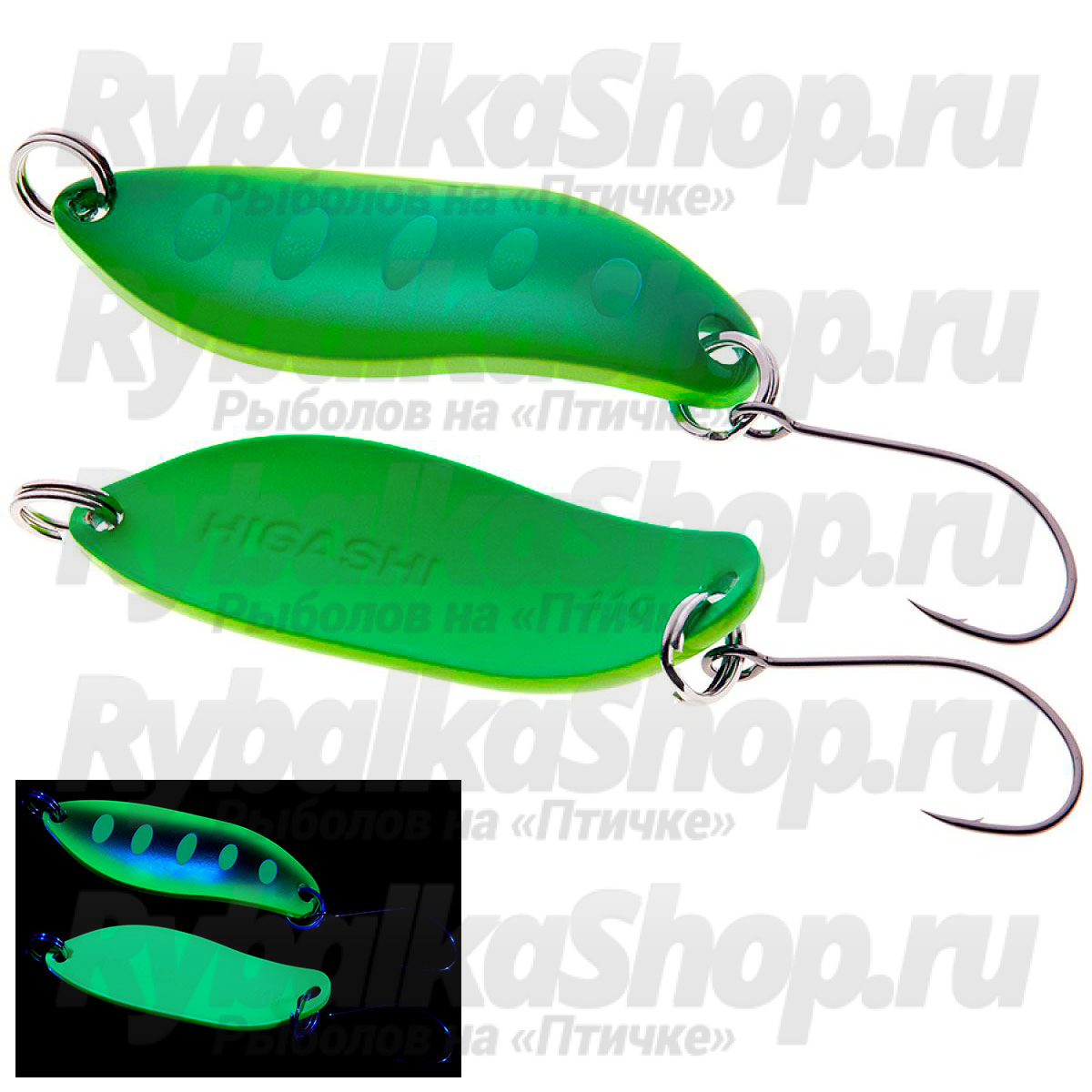 Блесна окрашена японскими флуоресцентными красками, которые светятся в ультрафиолетовом свете.