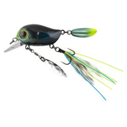 Особенности дизайна: KIKI MR 54F не похож на остальные воблеры-кренки, поскольку имеет в своей конструкции ряд оригинальных дополнительных элементов, призванных привлечь внимание хищной рыбы. Под брюшком у приманки находится подвижный металлический лепесток, который вращается при проводке, в задней части – жесткий пластиковый хвостик, который при движении в воде колеблется из стороны в сторону, а единственный тройник воблера оснащён мушкой из перьев и довольно длинных силиконовых нитей. Головная часть KIKI MR 54F рельефно имитирует жаберные крышки, а вклеенные объемные 3D глаза завершают реалистичный дизайн приманки.