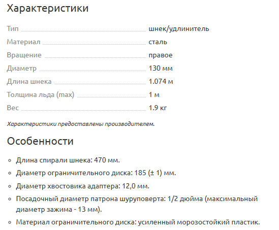 Рабочее направление шнека – правое. Шнек с диаметром 130 мм позволяет пробурить лед толщиной до 1 метра.