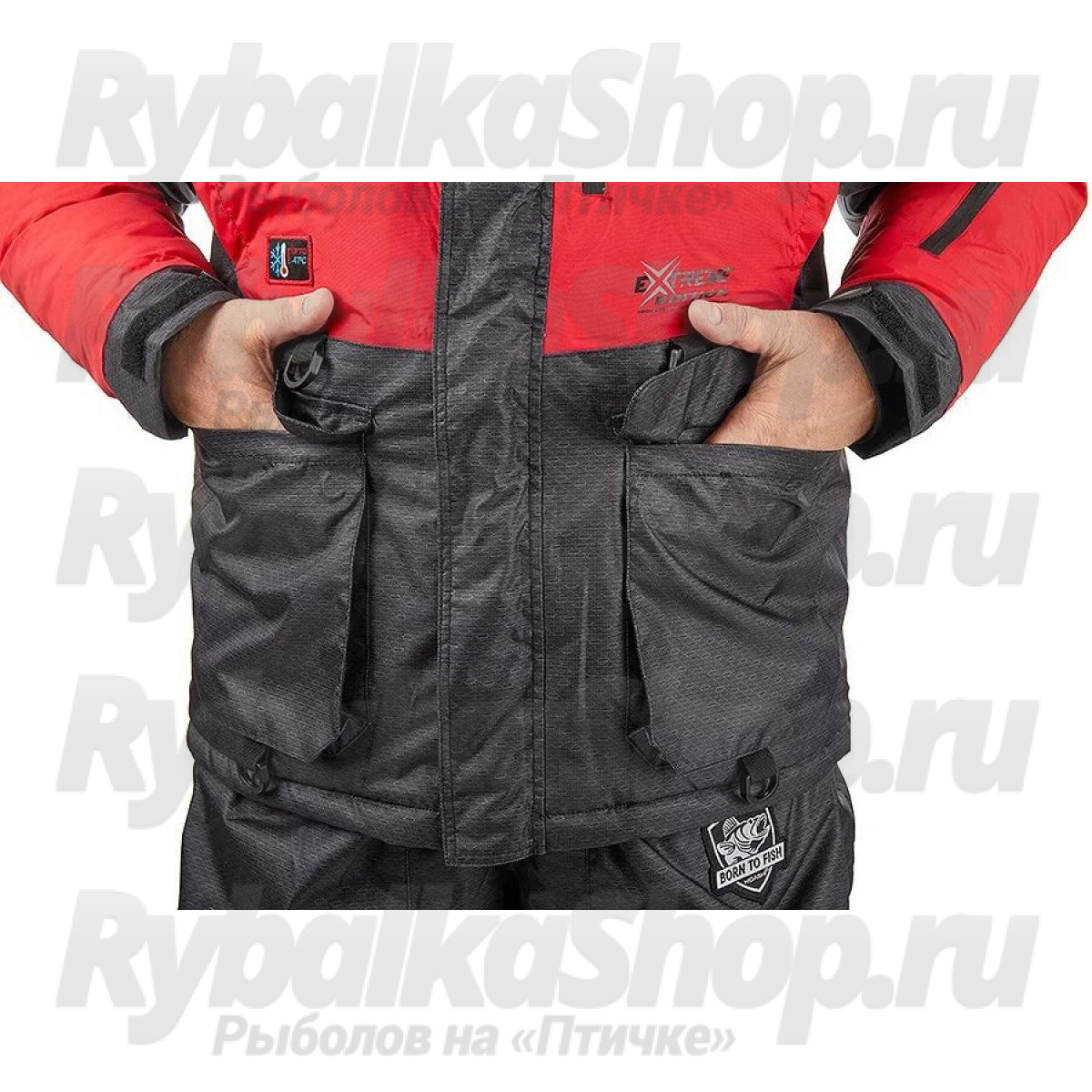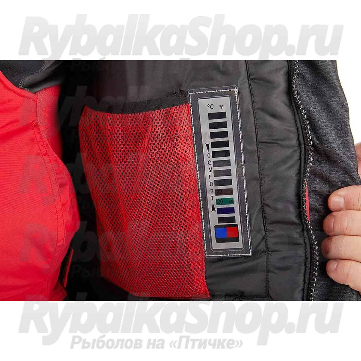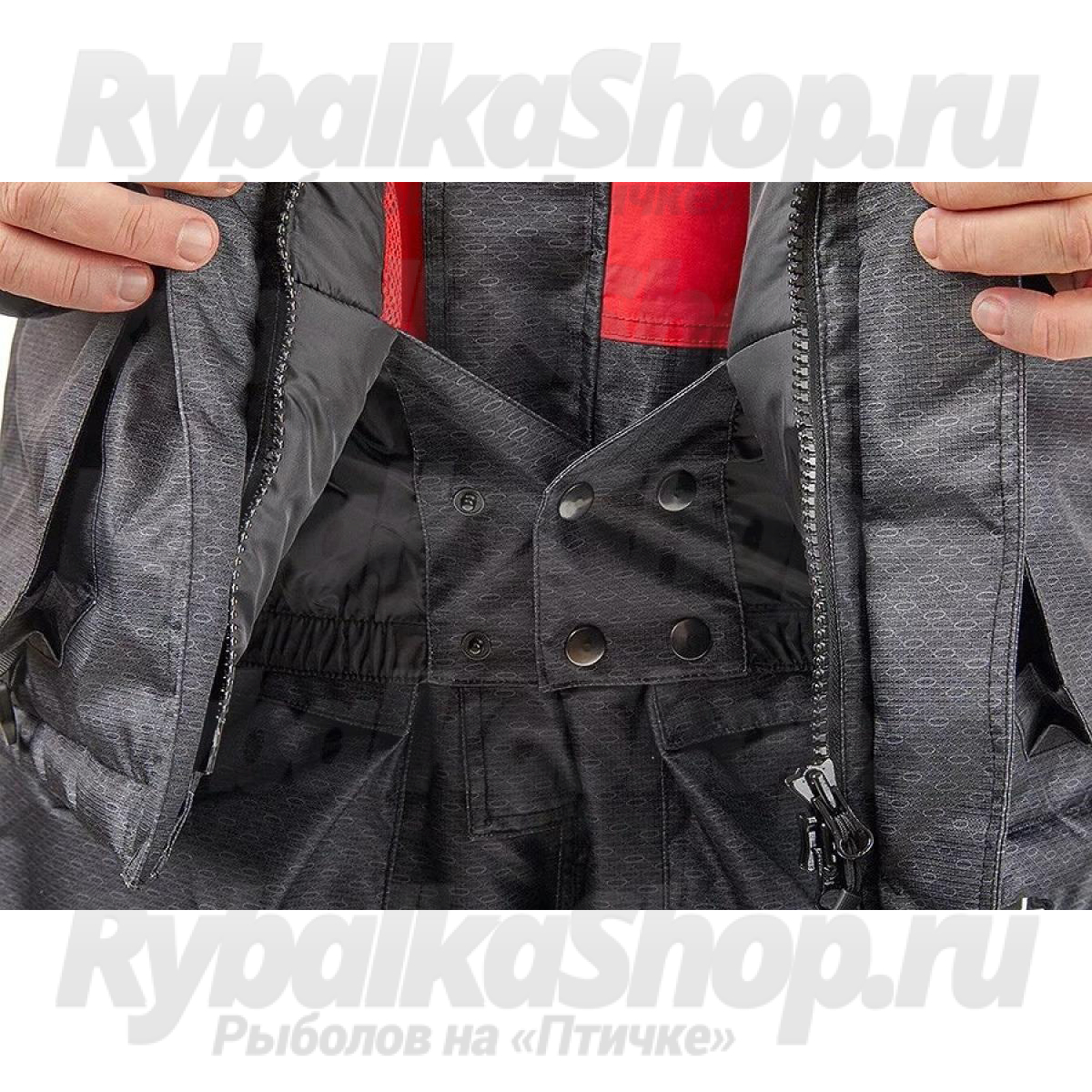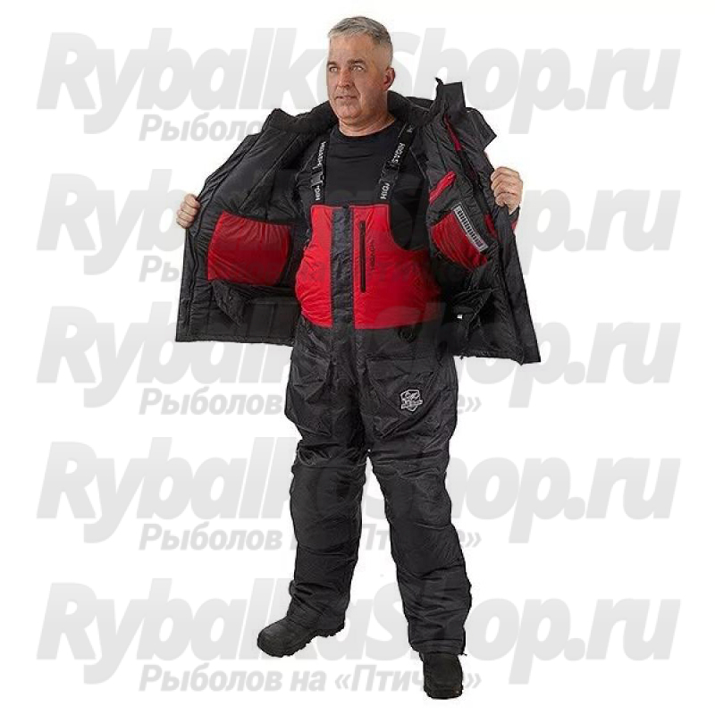 Костюм имеет большое количество карманов, куртка костюма оборудована снежной юбкой, есть регулировка длины брюк полукомбинезона. Чтобы быстро вытереть руки во время зимней рыбалки, в комплект костюма входят два небольших полотенца, которые можно закрепить на нижних карманах комбинезона.
