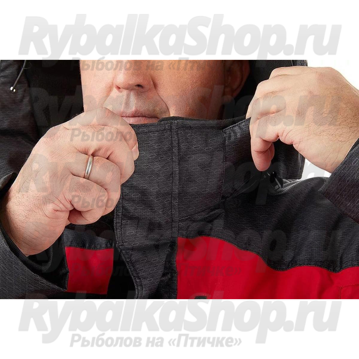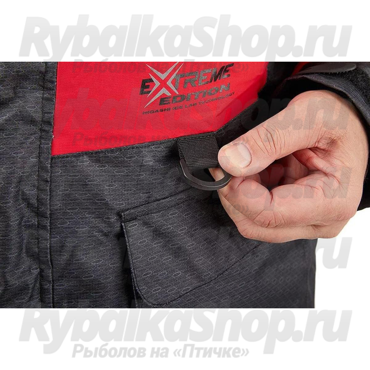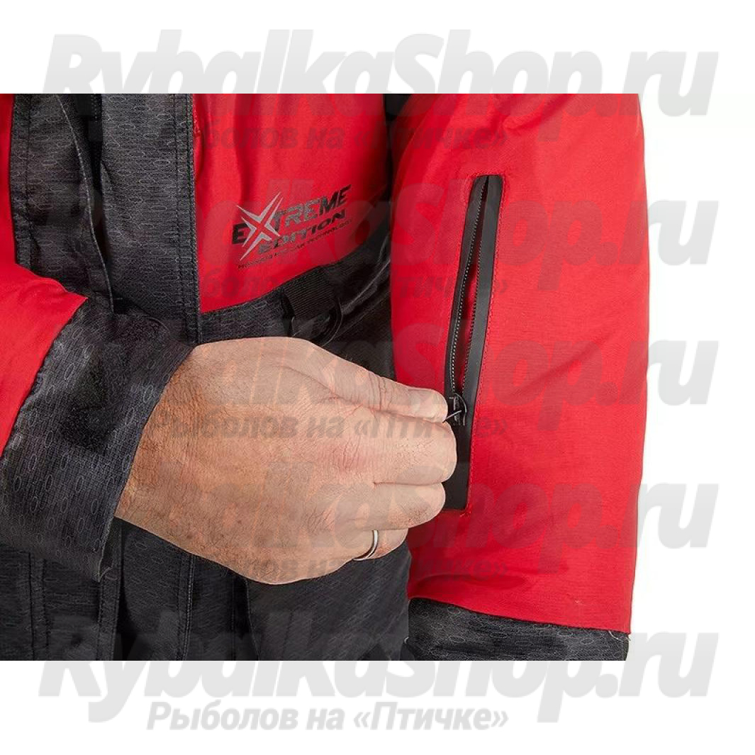 Костюм имеет большое количество карманов, куртка костюма оборудована снежной юбкой, есть регулировка длины брюк полукомбинезона. Чтобы быстро вытереть руки во время зимней рыбалки, в комплект костюма входят два небольших полотенца, которые можно закрепить на нижних карманах комбинезона.
