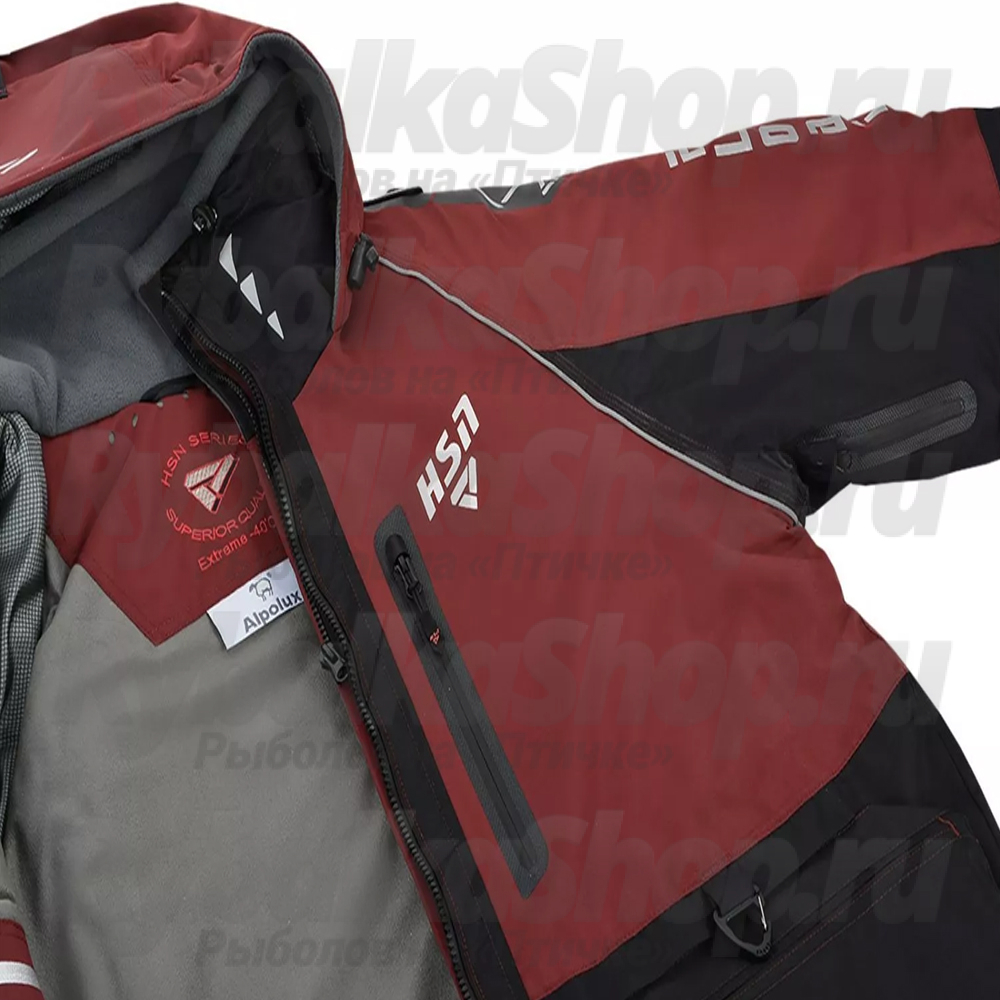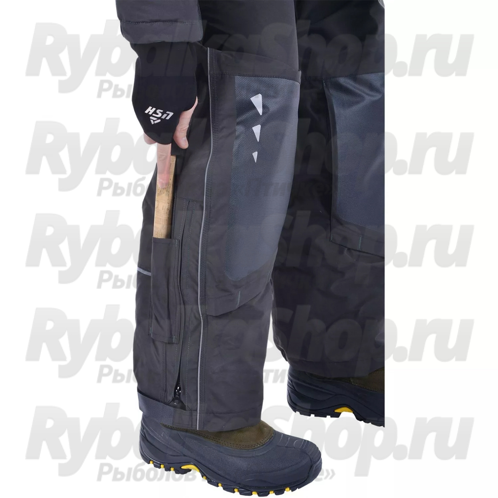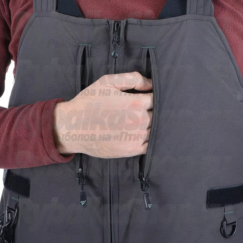 Высокий воротник куртки надёжно защищает от ветра, а удобный капюшон с жёстким козырьком эффективно противостоит ветру и влаге. Глубокие утепленные карманы предназначены для хранения необходимого инвентаря и согрева рук. Дополнительный съёмный карман с пластиковой коробкой для приманок (размером 22*12*2 см) крепится на молнии.