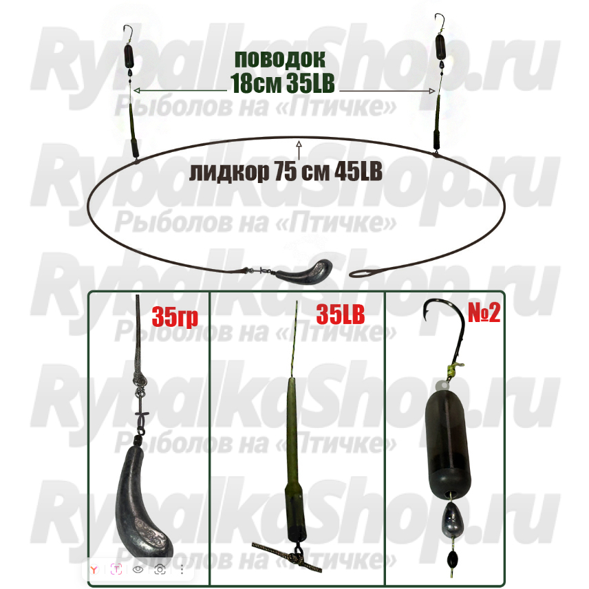 Тело оснастки сделано из лидкора (Великобритания), плотно прилегающего к дну водоема. Поводки сделаны на основе мягкого карпового материала большой разрывной нагрузки, оснащены крючком, отводом, отгруженным поплавком и стопором.