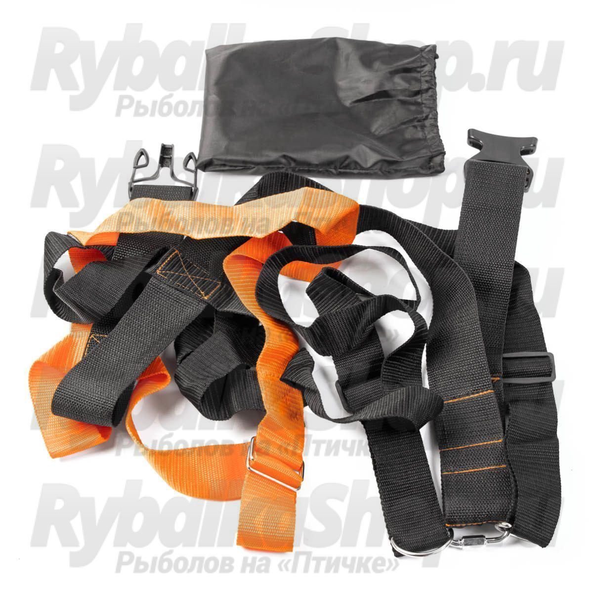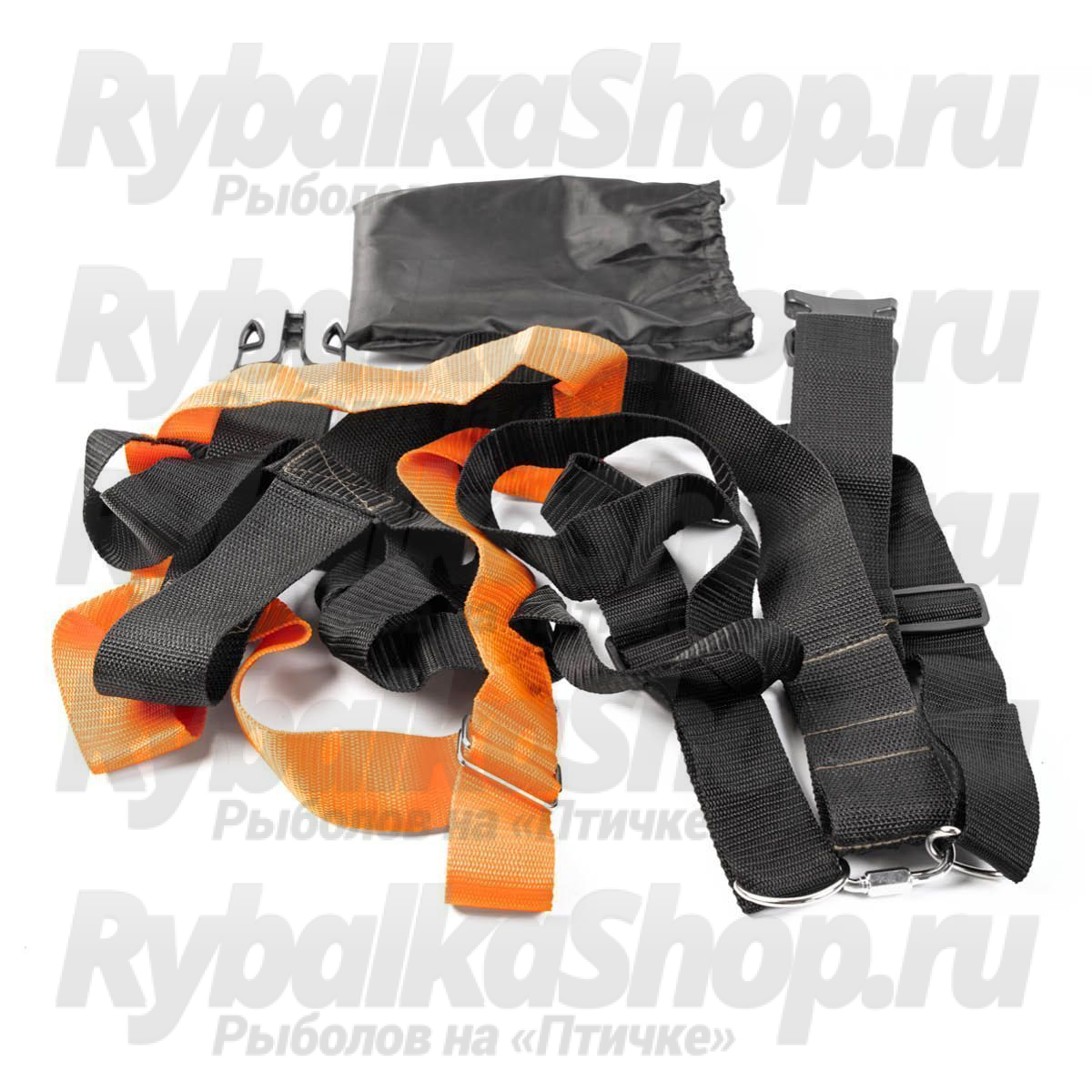 Основная широкая (50 мм) черная стропа берет на себя всю весовую нагрузку. Стропа имеет защелку, к ней крепятся лямки.