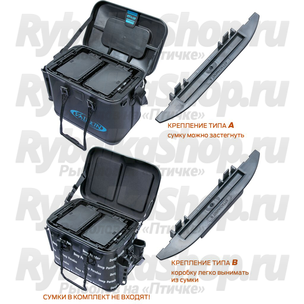 Комплект креплений типа A предназначен для установки коробки-трансформера внутрь сумки для транспортировки к месту ловли. В этом случае крепления не препятствуют застёгиванию молнии. Комплект креплений типа B предназначен для использования непосредственно во время ловли, эти крепления позволяют без труда вынимать коробку-трансформер из сумки. Обратите внимание, что входящие в комплект крепления могут быть несовместимы с продукцией некоторых производителей сумок!