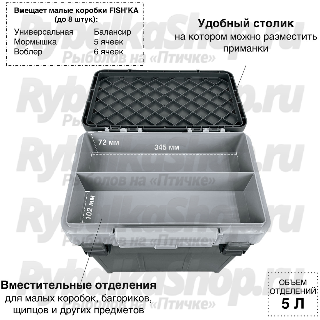 Средняя крышка ящика глубокая и разделена на два отделения, которые идеально подходят для хранения малых рыболовных коробок FISH'KA до 8 штук, багориков, весов, щипцов и других необходимых предметов.
