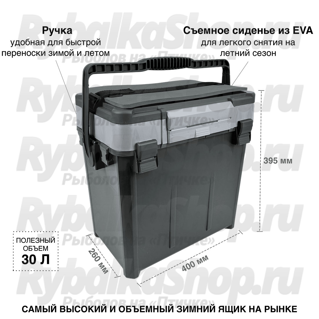 Ящик FISH'KA "Практик" изготовлен из морозостойкого ударопрочного полипропилена. В комплекте ручка и ремень.