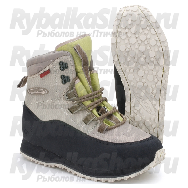 Ботинки Vision Hopper очень легкие и напоминают обычную туристическую обувь. Они сделаны из прочного нейлона с усиленным резиновым носком. Благодаря широкой передней части ботинки легко надеваются, и в то же время прочные нейлоновые петли для шнурков обеспечивают хорошую фиксацию ноги. Амортизирующие неопреновые вставки обеспечивают высокий комфорт и надежность. Ботинки Vision Hopper выпускаются с войлочной подошвой и резиновой Gummi с шипами.