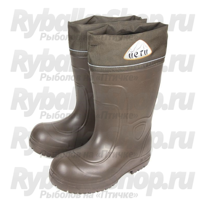 Мужские сапоги фирмы «Вездеход» серии «Йети» СВ-75 из ЭВА (EVA) с утеплителемМодель «Йети» изготовлена из этиленвинилацетата (ЭВА). Это легкий и упругий материал, имеющий хорошие амортизирующие свойства, даже при очень низких температурах, устойчивый к растворителям и маслам. Пористая структура ЭВА создает «воздушную прослойку» и позволяет сохранять тепло. Главное преимущество сапог «Йети» перед зимними бахилами и ботинками для суровых условий это их вес, а также возможность чувствовать себя комфортно при температуре до -60 *С, что позволяет использовать эти сапоги при длительной ходьбе, так и для продолжительного, малоподвижного пребывания на холоде. Высота сапога с манжетой 42 см, затяжная манжета из водоотталкивающей ткани препятствует попаданию снега и воды во внутрь сапога. Комплектуется комбинированным утеплителем из 7 слоёв.